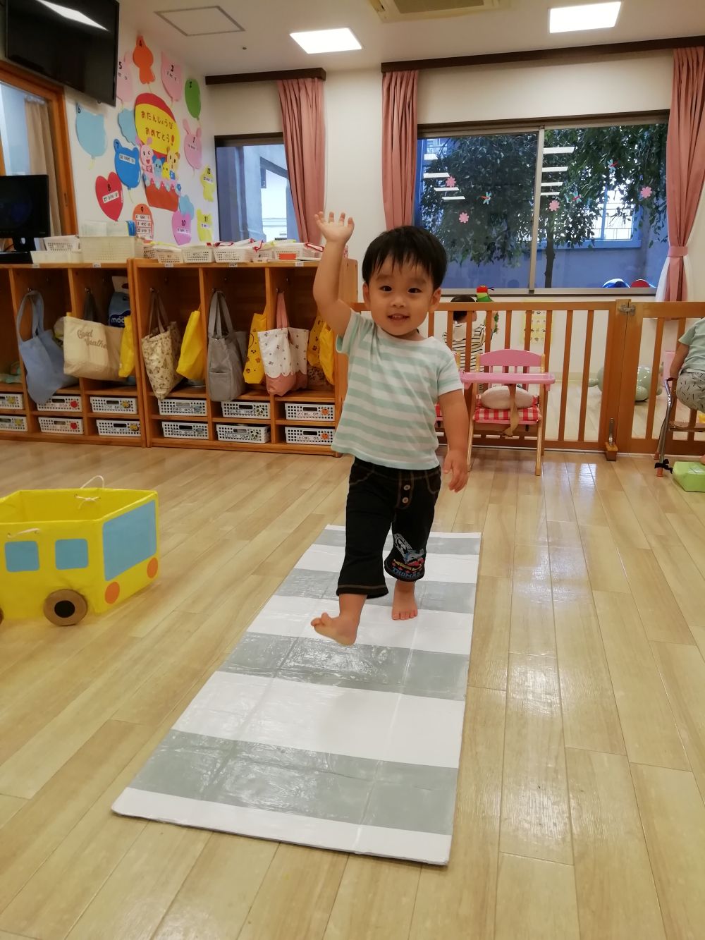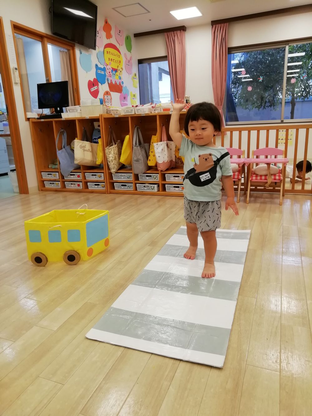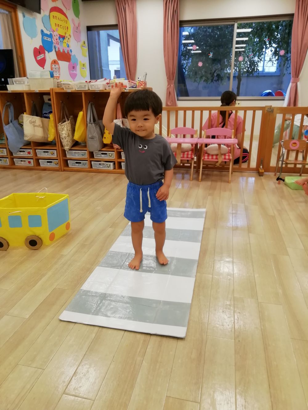 戸外へ出る機会が多くなる時期、交通ルールについて興味を持ってもらおうとお部屋で信号機の色の確認と横断歩道の渡り方を1.2歳児さんが練習しました🚦