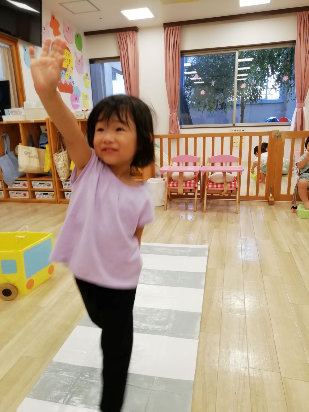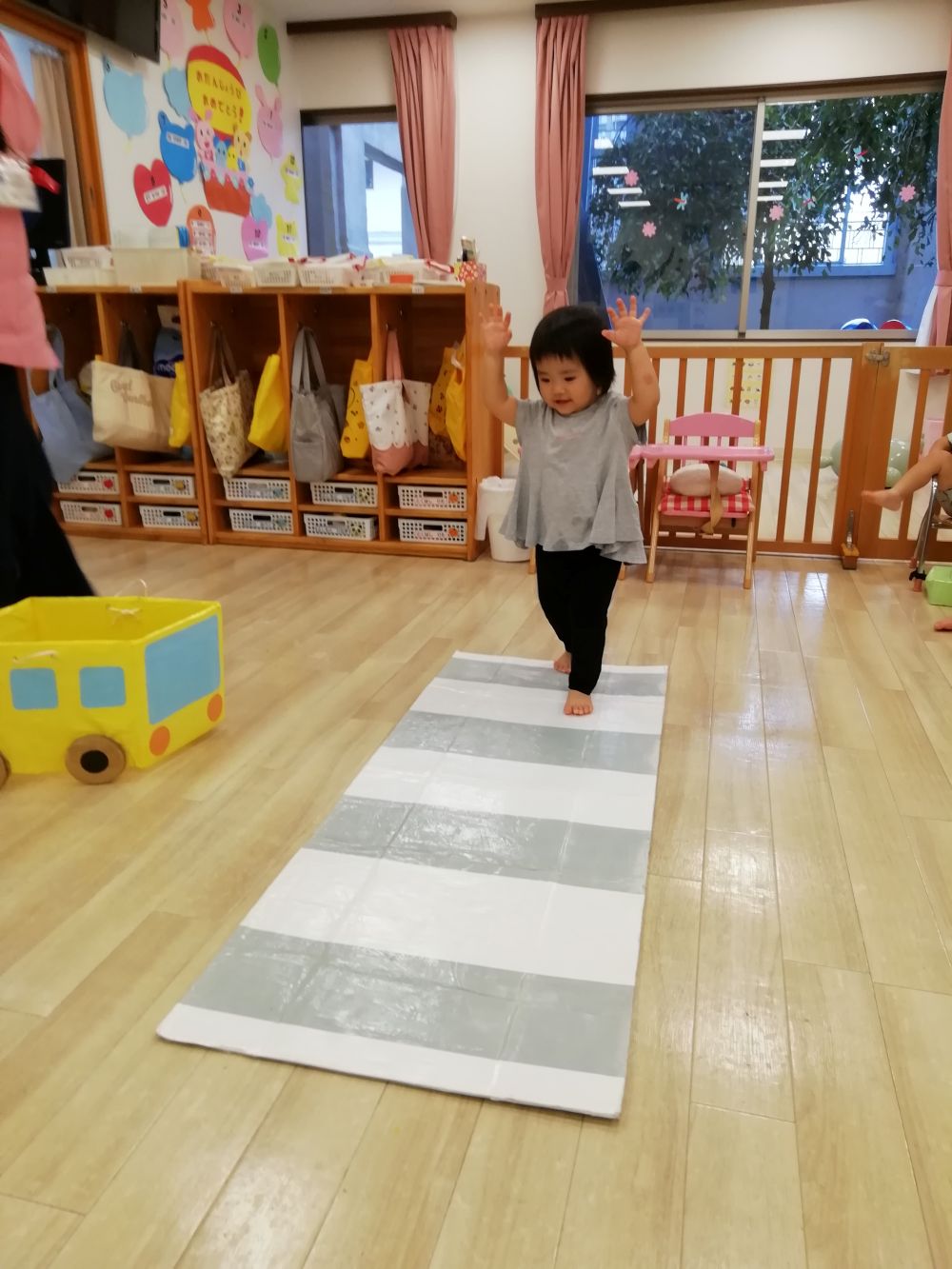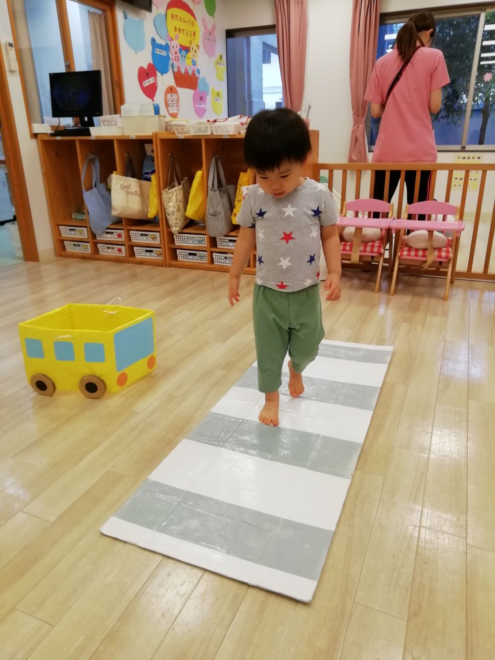 戸外へ出る機会が多くなる時期、交通ルールについて興味を持ってもらおうとお部屋で信号機の色の確認と横断歩道の渡り方を1.2歳児さんが練習しました🚦